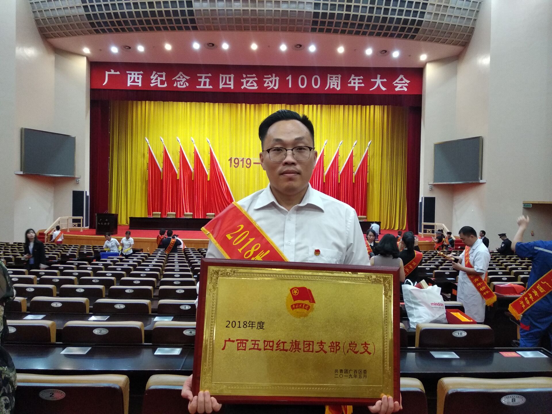 4月30日下午,广西纪念五四运动100周年大会在广西人民大会堂隆重召开,自治区党委书记、自治区人大常委会主任鹿心社发表重要讲话,自治区党委副书记、自治区主席陈武,自治区党委副书记孙大伟等区领导出席会议,并共同为获表彰的集体和个人代表颁奖。共青团YABO鸭脖基础医学院委员会荣获“广西五四红旗团支部(总支)”称号。