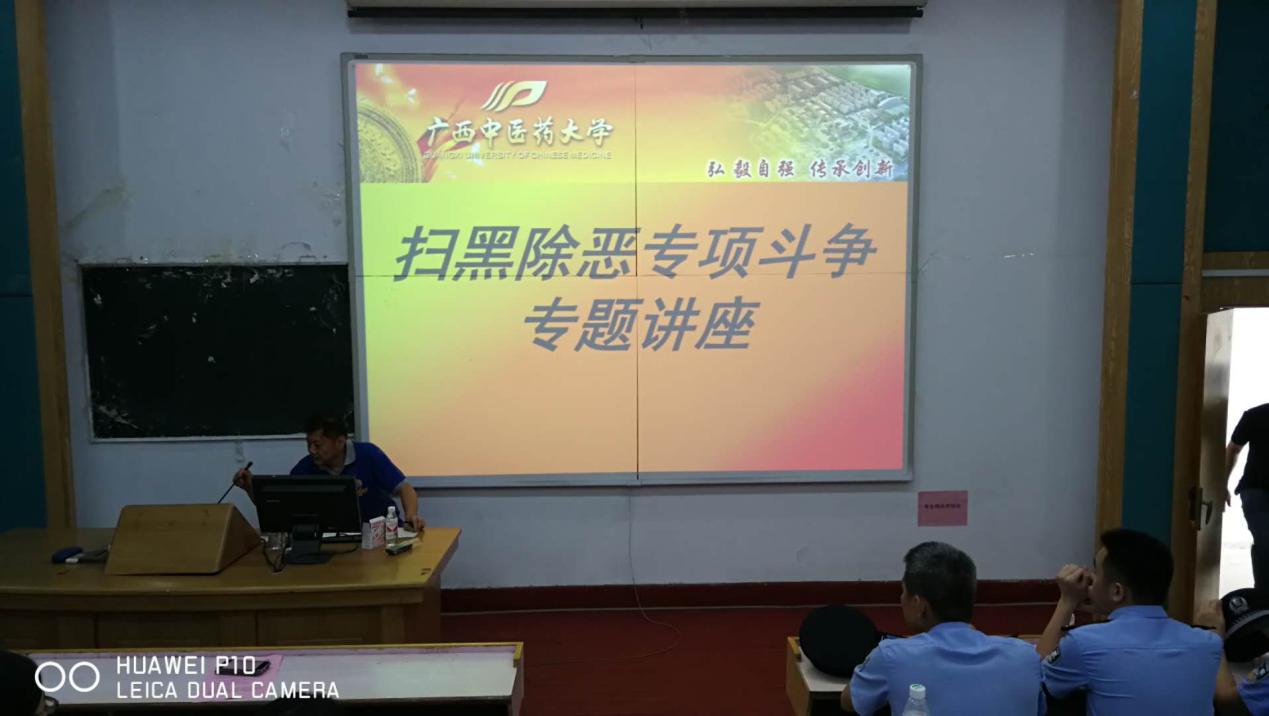 5月30日下午,在全国扫黑除恶专项斗争持续深入发展取得阶段性成果之际,鸭脖邀请南宁市公安局唐山派出所副所长黄继军一行3人在明秀校区西梯一教室开展“扫黑除恶专项斗争”专题讲座。明秀校区各单位、部门代表及全体辅导员、学生代表、安保物业人员等200多人参加。