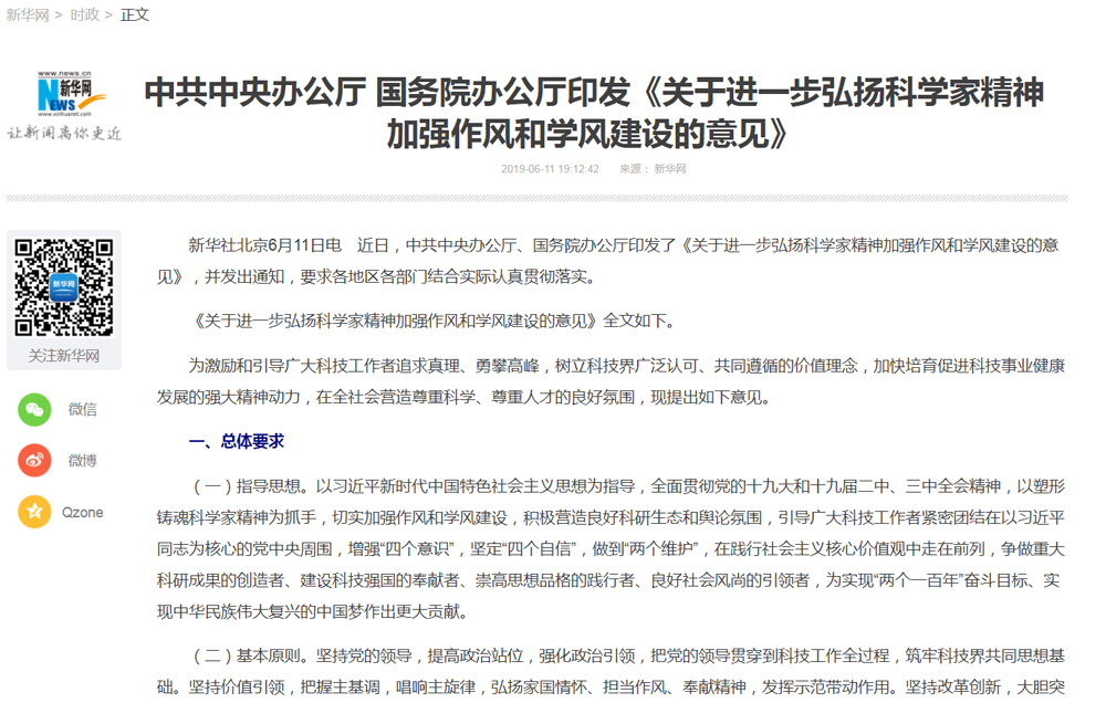 【新华网】中共中央办公厅 国务院办公厅印发《关于进一步弘扬科学家精神加强作风和学风建设的意见》