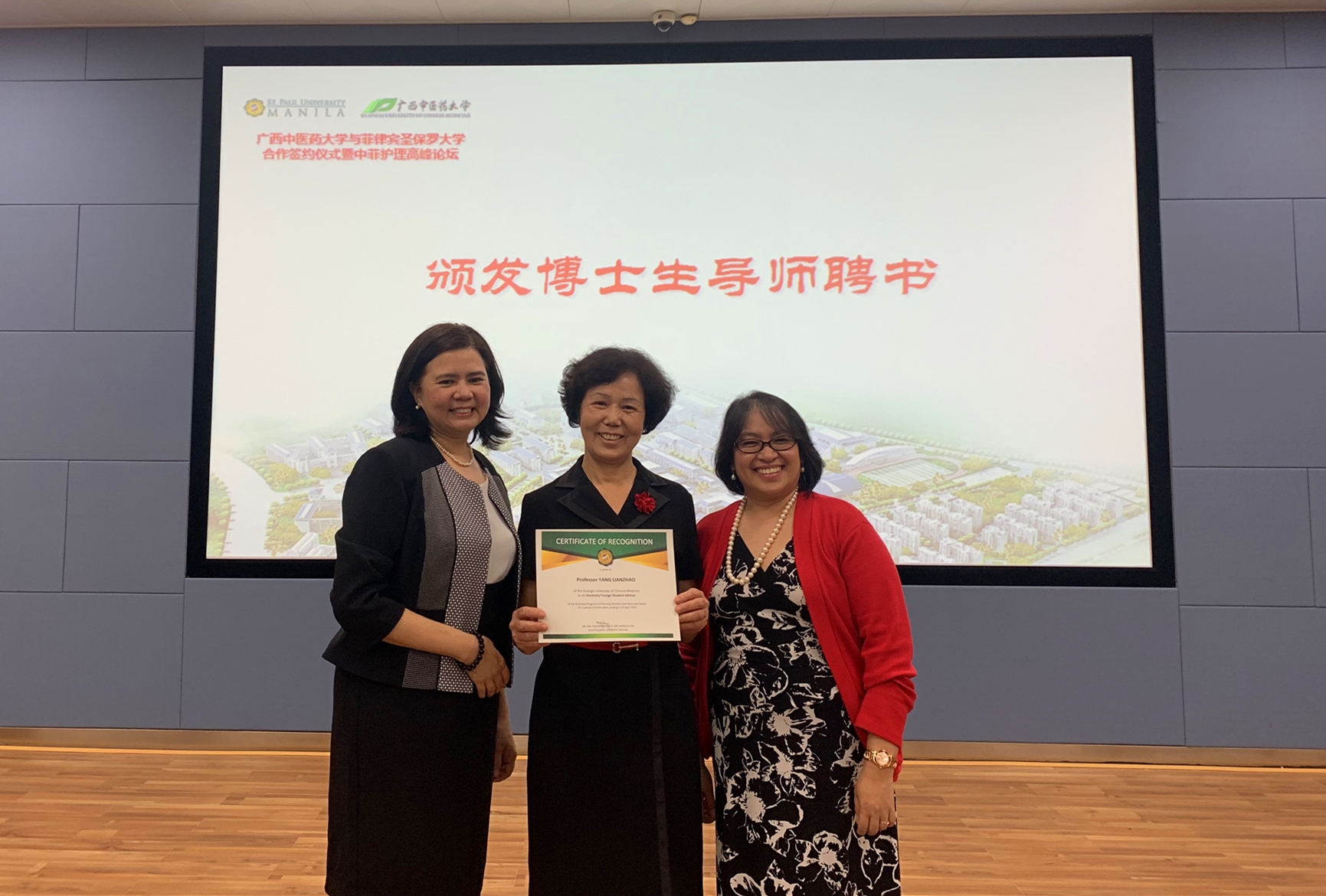 Ma Encarnacion Dychangco代表圣保罗大学为杨连招教授颁发校外博士生导师聘书