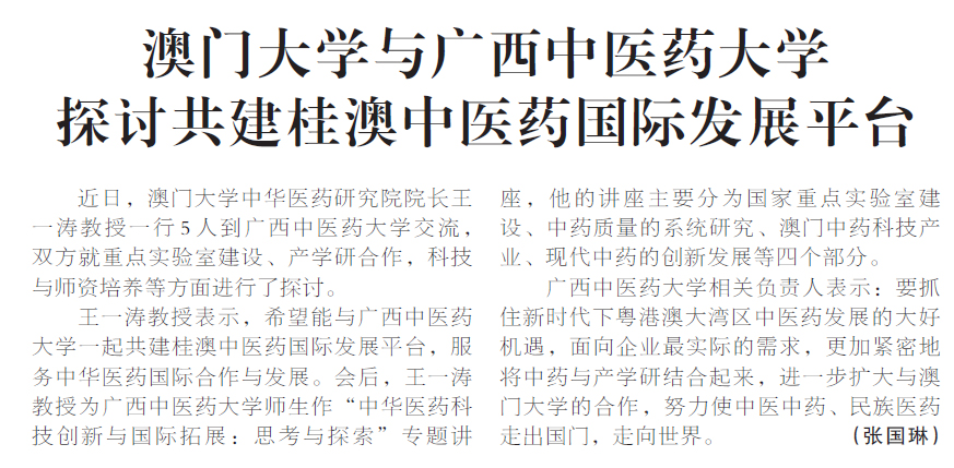 【广西日报】澳门大学与YABO鸭脖 探讨共建桂澳中医药国际发展平台