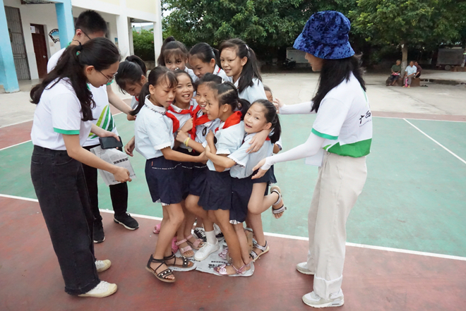 志愿者与留守儿童玩游戏