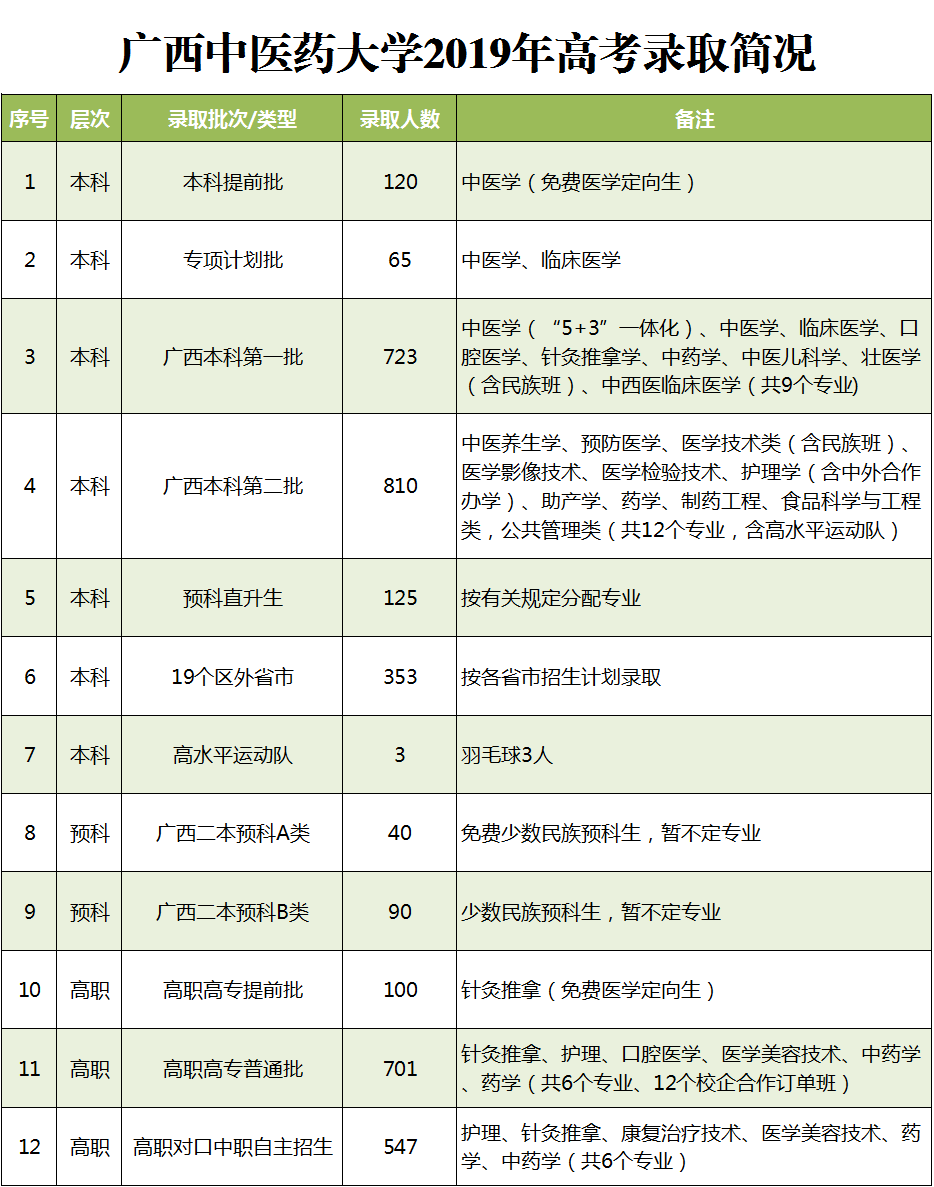 2019年鸭脖共在广西11个批次(类型)和19个区外省、市录取考生3547人,其中本科生2199人(含预科直升生125名),高职高专生801人,高职对口中职自主招生547人,还录取了预科生130人,简况如下: