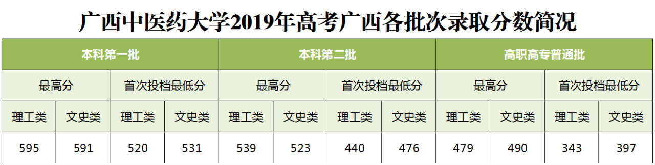今年录取的考生中广西生源占比84%(1845人),区外生源占比16%(354人)广西本科考生(本科第一批、第二批、专项计划批)的本科第一批上线率达51.06%(816人),较2018年提高1.06%;高职高专考生(高职高专普通批)本科上线率达94.15%(660人),较2018年提高37.91%。生源质量继续稳步提升。各批次录取分数简况如下: