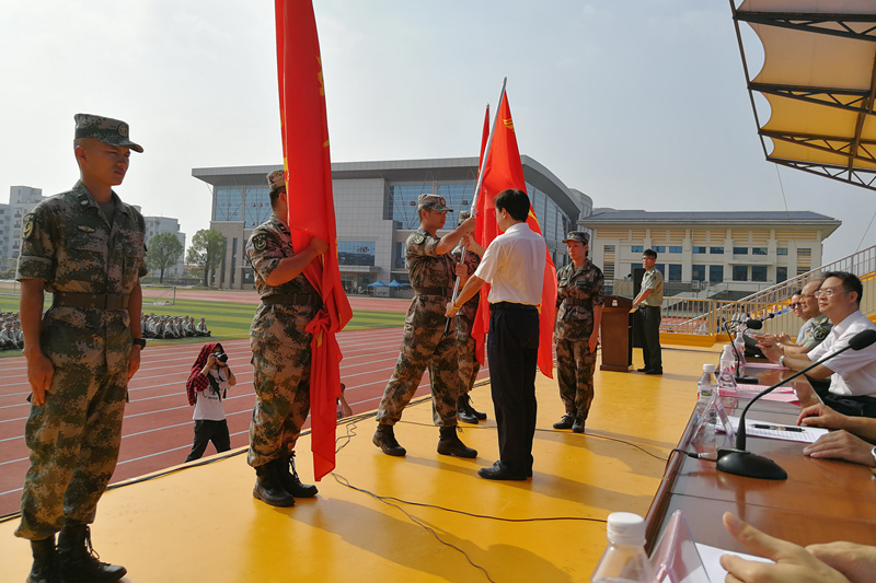 学校武装部部长张春宣布军训有关规定和要求,下达了本次新生军训任务。承训公司领导、参训学生代表也分别在仪式上致辞,教员们进行了动作示范虎虎生威,并举行了授旗仪式。