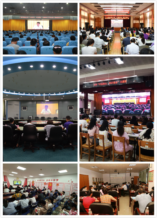 学校在家校领导、党委委员、纪委委员,部分老领导,学校党员干部,学校主题教育指导组成员,全校党支部书记,全校辅导员,民主党派负责人等共500余人参加会议。同时,仙葫校区大学生活动中心、明秀校区、第一附属医院、附属瑞康医院、附属国际壮医医院、制药厂设立分会场,近两千名师生观看大会同步直播。