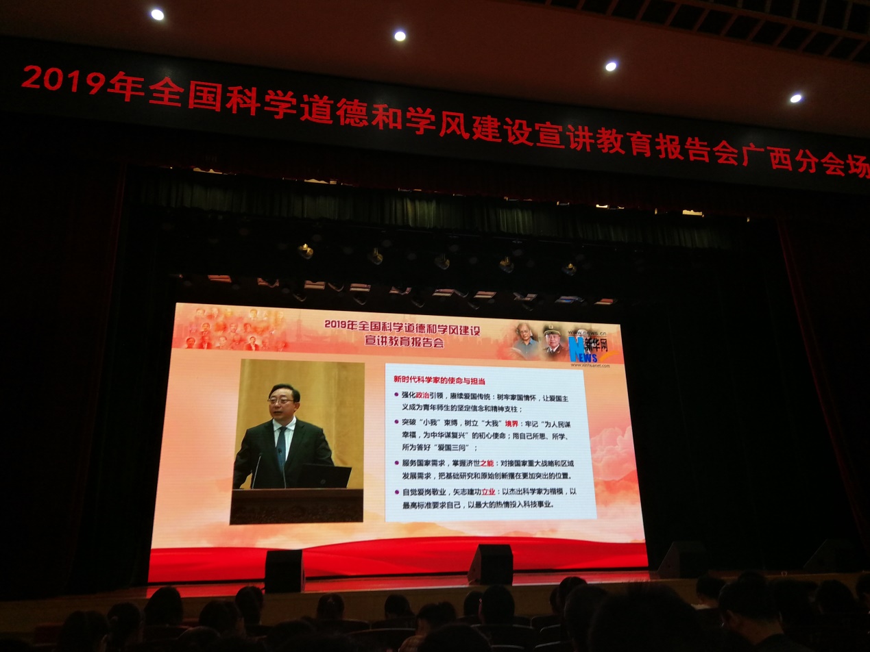 11月13日,2019年全国科学道德和学风建设宣讲教育报告会在人民大会堂举行。鸭脖组织青年教师、研究生、本科生200名师生代表赴广西大学大礼堂同步直播分会场,同时积极组织各学院、附属单位共500多名师生通过网络视频同步收看了报告会。