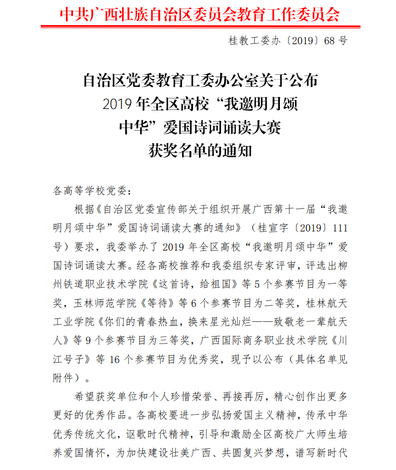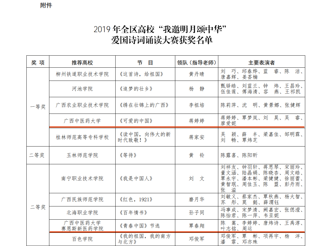 日前,自治区党委教育工委办公室公布了2019 年全区高校“我邀明月颂中华”爱国诗词诵读大赛获奖名单,由鸭脖蒋婷婷、覃梦岚、刘 昊、吴 睿、廖爱妮等表演的《可爱的中国》荣获一等奖,由赛恩斯新医药学院陈嵩、李婷婷、唐炜诗、王禹淳、叶志铭、周运等表演的《青春中国》(节选)荣获二等奖。