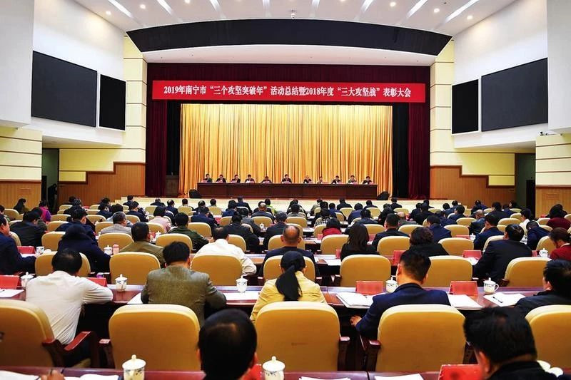 2019年12月27日,南宁市召开2019年“三个攻坚突破年”活动总结暨2018年度“三大攻坚战”表彰大会,总结经验,表彰先进,推动全市上下凝聚共识、激发干劲,进一步解放思想、改革创新、扩大开放、担当实干,自觉践行“四为”理念,真抓实干、善作善成、造福于民,不断推动各项工作取得新成效,为全面落实强首府战略、推动南宁高质量发展作出新的更大贡献。