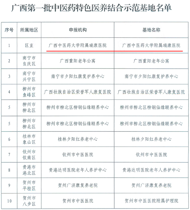 根据自治区中医药管理局、卫生健康委、民政厅、发展改革委、市场监管局、药监局联合印发的《关于开展中医药特色医养结合示范基地建设工作的通知》要求,经过组织申报、地方推荐、专家初审、实地评审、有关部门会审等环节,公示无异议。1月19日,以上部门联合印发《关于公布广西第一批中医药特色医养结合示范基地名单的通知》,确定附属瑞康医院、广西重阳老年公寓等10家基地(单位)作为“广西第一批中医药特色医养结合示范基地”,附属瑞康医院成为第一个获此殊荣的区直医疗机构。