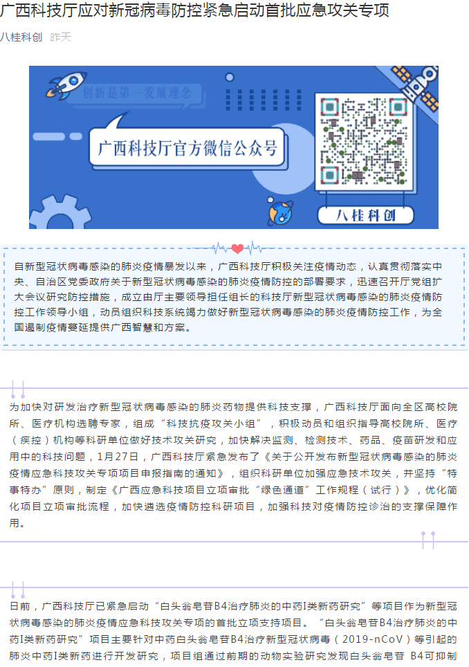 自新型冠状病毒感染引起的疫情暴发以来,鸭脖迅速响应自治区科技厅的号召,积极组织申报新型冠状病毒感染的肺炎疫情应急科技攻关专项项目。截止目前,以学校荣誉校长杨世林教授牵头的项目组申请的“白头翁皂苷B4治疗肺炎的中药I类新药研究”获得第一批立项资助,成为广西新型冠状病毒感染的肺炎疫情应急科技攻关专项首个资助项目。