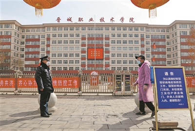 为了防止疫情向校园蔓延,山西晋城职业技术学院对校园阵地严加管控,未经学校批准学生一律不准返校,校外无关人员一律不准进校门,并且一天两次对重点区域进行全面消杀。图为晋城职业技术学院大门口。 张宇鹏 摄