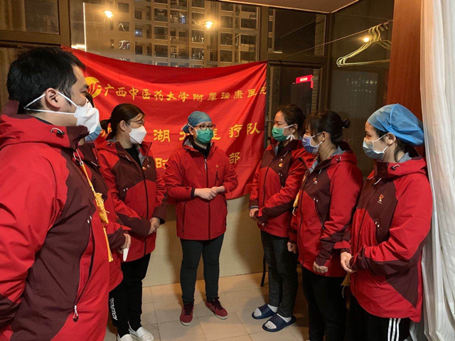 下午4时,广西医疗队一行前往沌口方舱实地培训。在回酒店的路上,医疗队接到紧急通知,武汉沌口方舱医院当晚就要收治第一批病人,也就意味着医护人员将正式投入救治工作中。军令如山,面对突如其来的紧急任务,鸭脖医疗队队员主动请缨,出征首战。欧阳暾、农彩芬、胡春明、唐运宽等成为正式进入沌口方舱医院的第一批广西医疗队队员。唐运宽表示:“临时接到命令,一切服从指挥,心里时刻提醒自己,保护好自己,就是保护好广西队。”