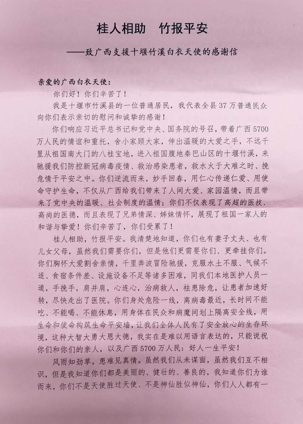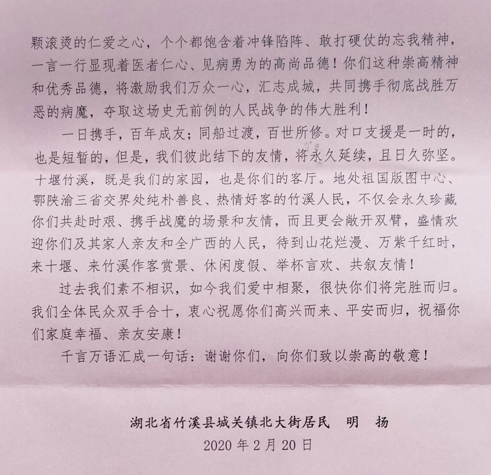 【中医战“疫”】桂人相助 竹报平安——致广西支援十堰竹溪白衣天使的感谢信 日期:2020-02-22 点击数: 次 分享到: 2月20日,竹溪县党委宣传部副部长明扬致信鸭脖驰援湖北竹溪医疗队队长陈平,对鸭脖9名医疗队员表示感谢。感谢信全文如下: 打印正文 关闭本页