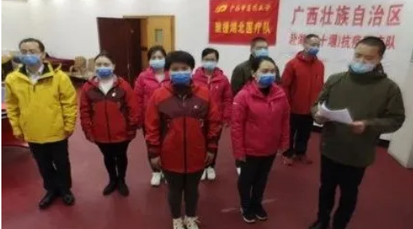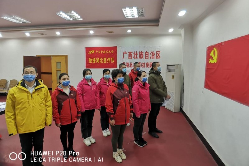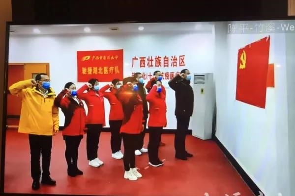 “我志愿加入中国共产党,拥护党的纲领,遵守党的章程,……为共产主义奋斗终身!……”3月6日晚,一场特殊的入党宣誓仪式在鸭脖第一批驰援湖北医疗队竹溪县驻地举行。第一附属医院郑春秋、附属瑞康医院重症医学科二区护士长覃惠娟、附属国际壮医医院急诊急救联动中心护师莫凡高举右拳,面对鲜红的党旗,以特殊而庄严的火线入党方式成为光荣的中共预备党员。鸭脖赴湖北竹溪医疗队临时党支部书记陈平为预备党员戴上党徽,并带领全体党员入党宣誓、重温入党誓词。
