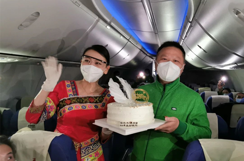 万米高空上,医疗队员们唱起了《我和我的祖国》。机组工作人员为在三月份过生日的鸭脖蔡伦、李咏翔等队员送上生日蛋糕与贺卡,广西队全体队员同唱生日快乐歌,为他们庆生。