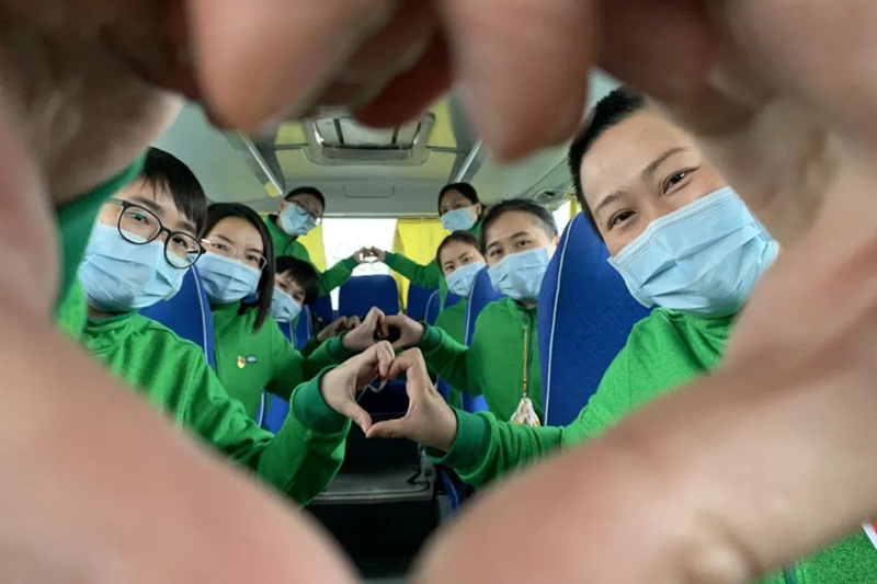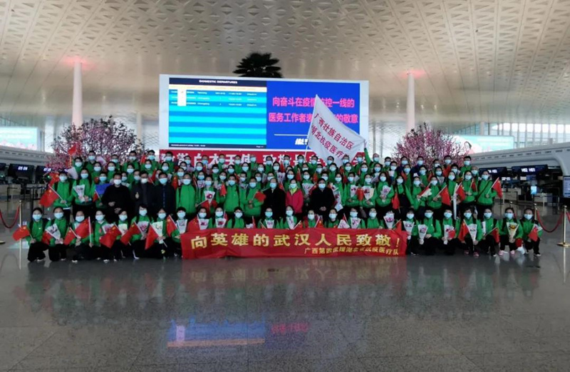 飞雪夜援汉,风雨送春归。从2月15日紧急出征,在大雪纷飞的夜晚到达武汉“战场”,到3月29日凯旋,春雨纷飞的南宁已是春意盎然。守望武汉的45个日夜,鸭脖50名队员守护沌口方舱,转战协和医院,所在的广西第四批驰援湖北医疗队也成为广西唯一一支两地“战斗”的队伍。在武汉开发区(汉南区)沌口方舱医院,鸭脖队员整整战斗21天,用医术治疗疾病,用仁心安抚患者,得到方舱医院领导、同舱医疗队、病友的高度评价。经过短暂的休整,他们再披战袍,与广西第四批医疗队一起迅速转战武汉协和医院西院,在重症病区、发热门诊等科室参加重症病人救治工作,在大家的共同努力下,一批又一批患者康复出院。在忘我奋战的日日夜夜,他们同时间赛跑、承受着难以想象的身体和心理压力,全力以赴与病魔较量,用实际行动诠释了医者仁心的初心使命。