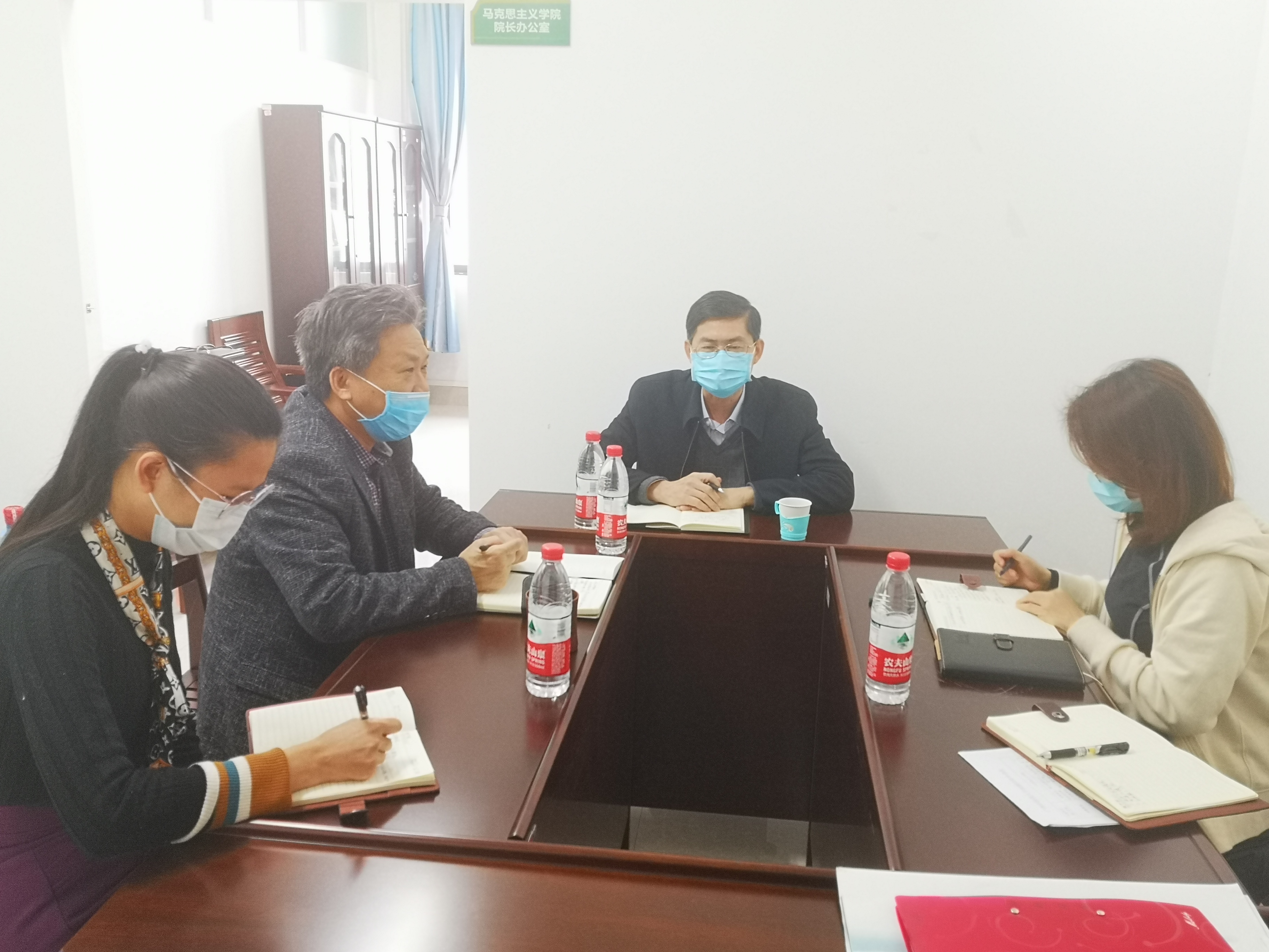 何并文听取了韦兆钧的工作汇报后对马院新学期工作提出了三点建议和要求:一是继续按照自治区、学校文件的有关规定,继续落实疫情防控的相关工作,保证全体教师的生命安全;二是着力提升教学质量,教学是工作的重中之重,要将疫情防控中的典型事迹融入思政课教学,不断丰富思政课内容,有理有据阐述中国特色社会主义制度的优越性,树立学生战胜疫情的信心,提升学生的爱国主义精神;三是补齐科研短板,出高质量成果。要凝练好研究方向,加强马克思主义一级学科建设,利用科研团队的集体研究,出高质量成果。作为思政科学研究者、特别是医学类院校的思政研究者,我们需要思考如何教育引导新时代医学生,如何构建新时代医学人文精神。