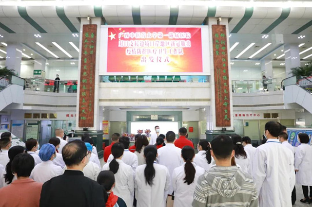 吹响集结号,整装再出发!4月15日上午,鸭脖第一附属医院、附属瑞康医院、附属国际壮医医院分别举行出发仪式,欢送自治区派驻边境口岸医疗卫生工作队队员,到广西边境地区指导和参与疫情防控和医疗救治工作。