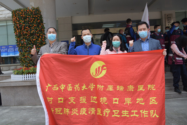 第一附属医院出发仪式在东葛院区门诊大堂举行。医院领导桂雄斌、谢胜、吴西西、钟远鸣、周广林、卢健棋、毛德文、黄仲海、张高炼、苏泽凤及相关科室负责人参加出征仪式,为4位白衣战士赵莹、文礼、黄夏冰、张元侃壮行。医院党委书记桂雄斌希望队员们能展现广中医悲悯为怀,精益求精的精神风貌,发挥中医药在防治新冠肺炎的优势,圆满完成边境地区新冠肺炎疫情防控和医疗救治工作。出征仪式后,黄夏冰、张元侃随所在的医疗卫生工作队启程前往东兴市,赵莹、文礼所在的医疗卫生工作组奔赴大新县。