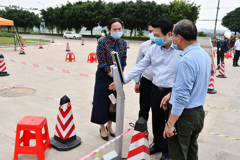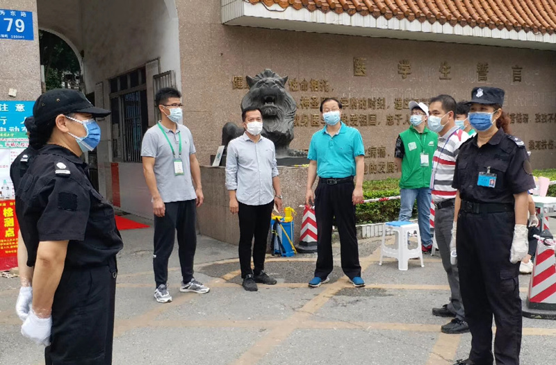在仙葫校区晨钟暮鼓楼前,返校同学在工作人员的指引下有序排队,在经过红外体温测量、身份核查、行李物品消杀、分发口罩四个过程后,坐上电瓶车进入校园。尤剑鹏书记在检查指导时表示,要按照既定开学工作方案,落实疫情联防联控责任,抓好抓实抓细学生开学返校各项工作,密切关注学生返校后的健康状况,控制疫情蔓延,确保师生的安全健康,平安有序地做好师生返校各项工作。