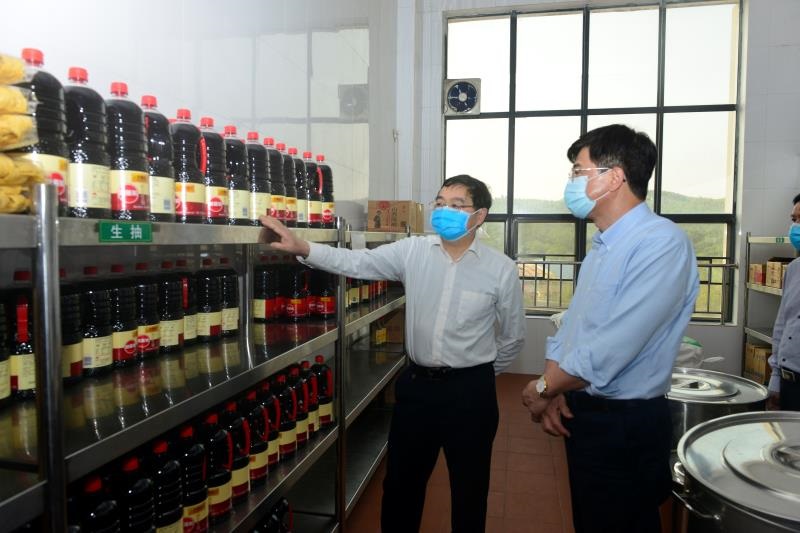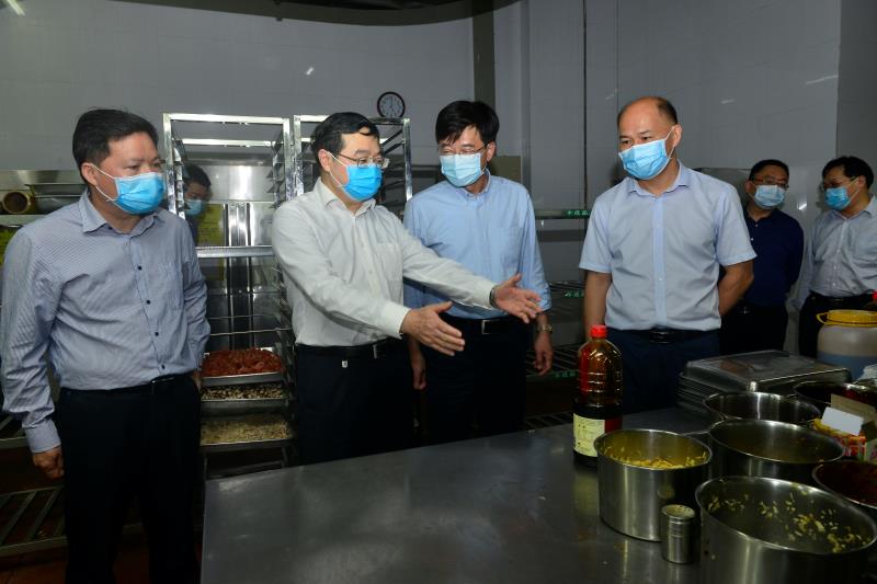 吴琪俊陪同李勇强一行检查了五和食堂的就餐大厅、就餐措施、后厨烹饪间、洗消间、仓库以及食品留样等,介绍鸭脖食品安全监管基本情况以及新冠肺炎防疫食品卫生安全把控等情况。