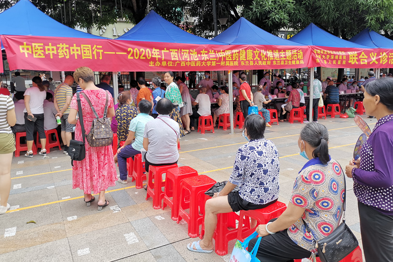 东兰县政府、卫健局对此次义诊高度重视,提前一周通过电视对前来义诊的专家进行宣传,为义诊活动预热。义诊当天,韦杏立副县长、县卫健局唐伟局长首先陪同专家到县中医医院新址参观,9点一同来到东兰县文化中心广场的义诊现场时,县各村屯闻讯而来的群众早已等待多时了。虽然疫情防控已进入常态化管理,但义诊现场井然有序,老百姓自觉排起了长队依次看诊。专家们问诊的同时,还进行脉诊,舌诊看不清还用上手机的手电筒。当地老百姓对专家的工作态度和医疗技术水平也是赞不绝口。