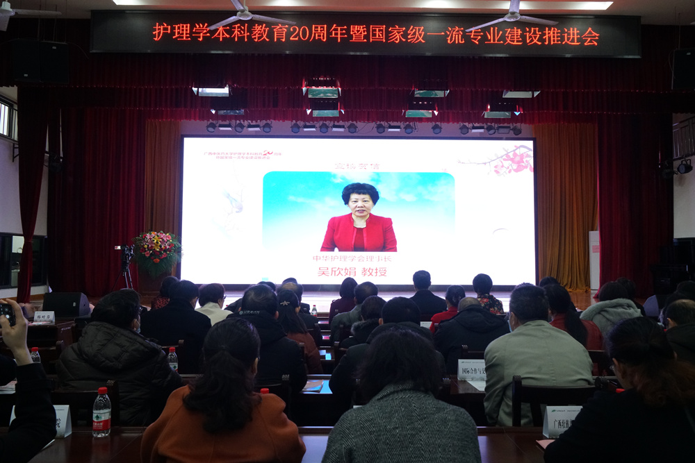 会上,护理学院党委书记、院长吴彬对学校护理学本科教育20年进行了简要回顾。会议宣读了教育部高等教育护理学类教学指导委员会主任委员、北京大学护理学院院长尚少梅教授、中华护理学会理事长吴欣娟教授、广西本科高等学校护理学类教学指导委员会主任委员陈俊强教授及兄弟院校南京中医药大学护理学院发来的贺信。会议还通过视频方式,邀请教育部高等学校护理学类教学指导委员会秘书长孙宏玉教授作了题为《新时代 新理念本科护理教育专业及课程建设思考》报告,南京中医药大学副校长徐桂华教授作了题为《中医药院校一流专业建设的思考》的专题讲座。