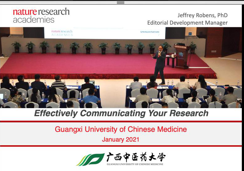 本次培训的主讲人Jeffrey Robens博士,是Nature Research的编辑开发经理,拥有20年多年丰富的学术经验和研究背景,他从论文撰写前的准备到投稿、发表后的工作进行了清晰的说明,涵盖了有效的学术写作、论文结构、最大限度提升论文可见度、论文发表的伦理问题、成功投稿的策略以及同行评议的解读等。Jeffrey Robens博士的讲课生动形象,贴近生物医学、中医药研究领域,引发听众的共鸣;有趣的互动练习和讲解,加深了听众对知识的理解。