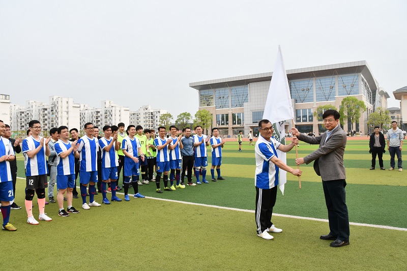 吴琪俊为足球协会授旗,教学实验实训中心常务副主任、足球协会副会长韦维代表协会接旗。随后,吴琪俊和工会副主席彭岸林为足球协会的友谊赛开球。