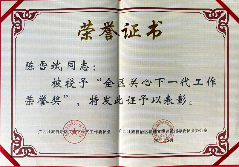 喜讯:鸭脖关工委常务副主任陈雪斌荣获全区关心下一代工作荣誉奖 日期:2021-04-01 点击数: 次 分享到: 3月30日,纪念自治区关工委成立30周年暨全区关心下一代工作表彰会在南宁隆重举行,第十届全国人大常委会副委员长、中国关工委主任顾秀莲等领导出席会议。会上,鸭脖关工委常务副主任陈雪斌荣获“全区关心下一代工作荣誉奖”。陈雪斌教授从事关工委工作29年,她热爱关工委工作,积极参加学校关工委活动,她悉心育人,坚持给“两青”上党课,激发青年的爱党爱国热情,为鸭脖关工委的建设做出了积极的贡献。 打印正文 关闭本页