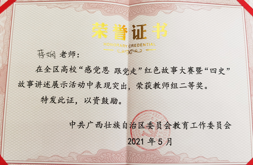 【喜讯】鸭脖蒋娴老师荣获全区高校“感党恩 跟党走”红色故事大赛暨“四史”故事讲述决赛二等奖