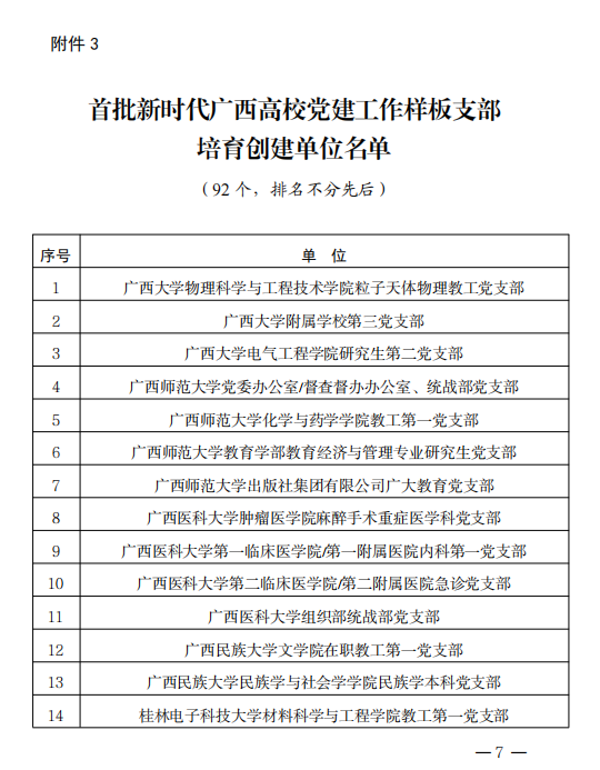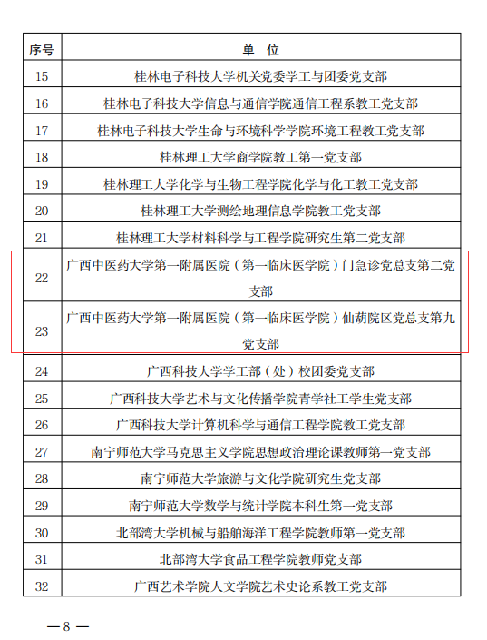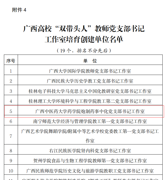 近日,自治区党委教育工委公布了首批新时代广西高校党建工作示范高校、标杆院系、样板支部培育创建名单。鸭脖第一附属医院(第一临床医学院)门急诊党支部第二党支部、仙葫院区党总支第九党支部获评首批新时代广西高校党建工作样板支部培育创建单位,药学院炮制药事中化党支部书记工作室获评广西高校“双带头”教师党支部书记工作室培育创建单位。