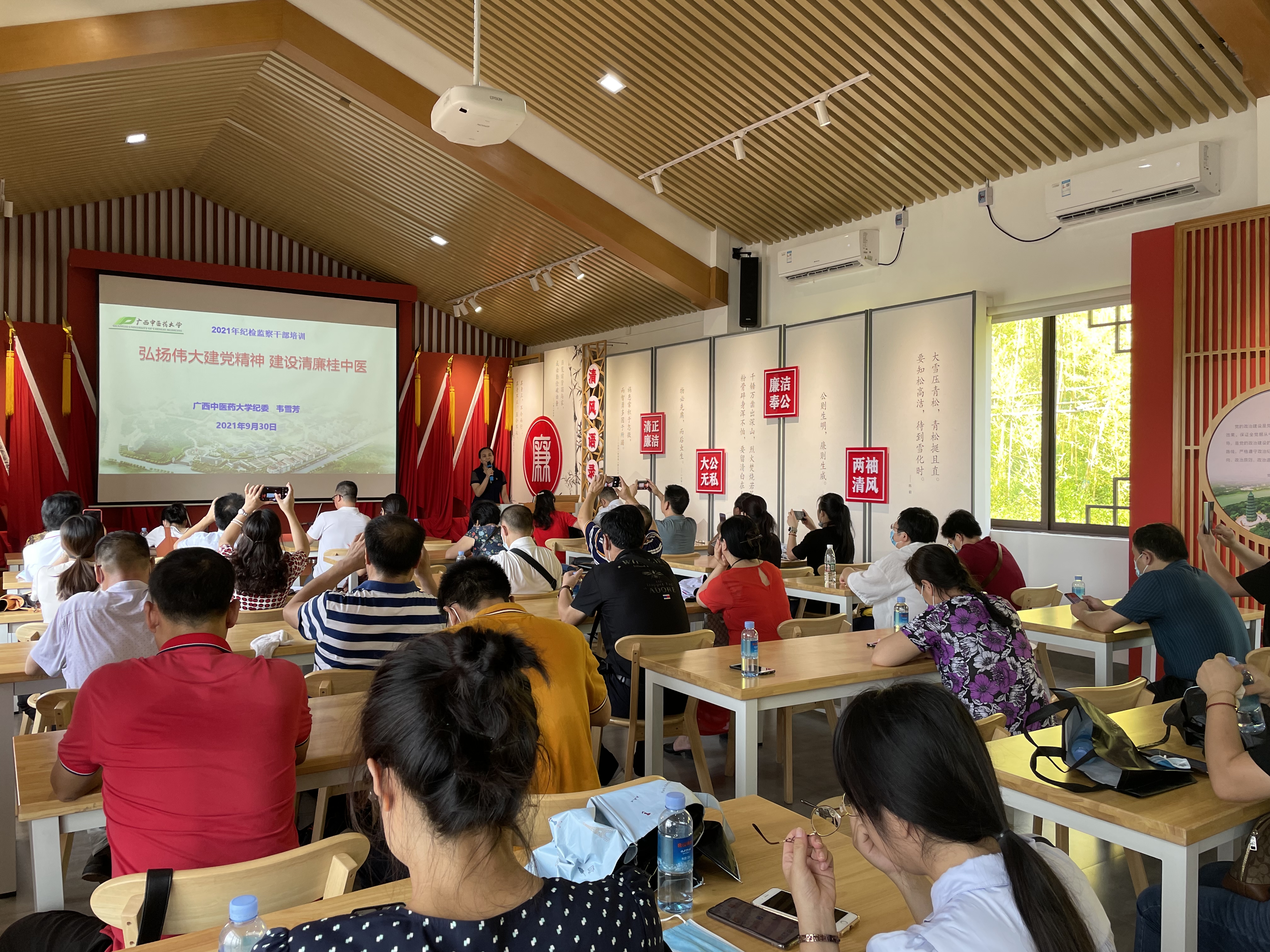 参观主题文化园后,全体干部在研习馆开展了业务培训。校纪委韦雪芳书记做“弘扬伟大建党精神 建设清廉桂中医”专题报告,传达了自治区党委常委、纪委书记、监委主任房灵敏重要讲话精神。她要求,纪检干部要坚持真理、坚守理想,自觉学习竹廉文化,坚守清廉本色,培育廉政勤政、以廉养德的高贵品质;要自觉增强廉洁自律意识,始终保持忠诚干净担当的政治本色。