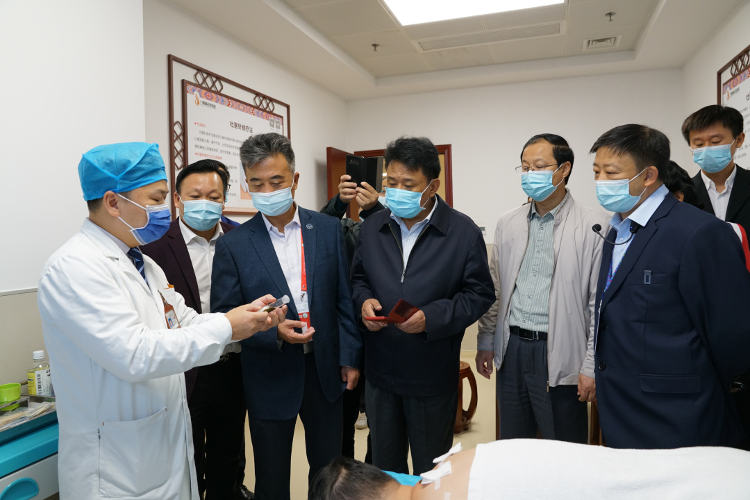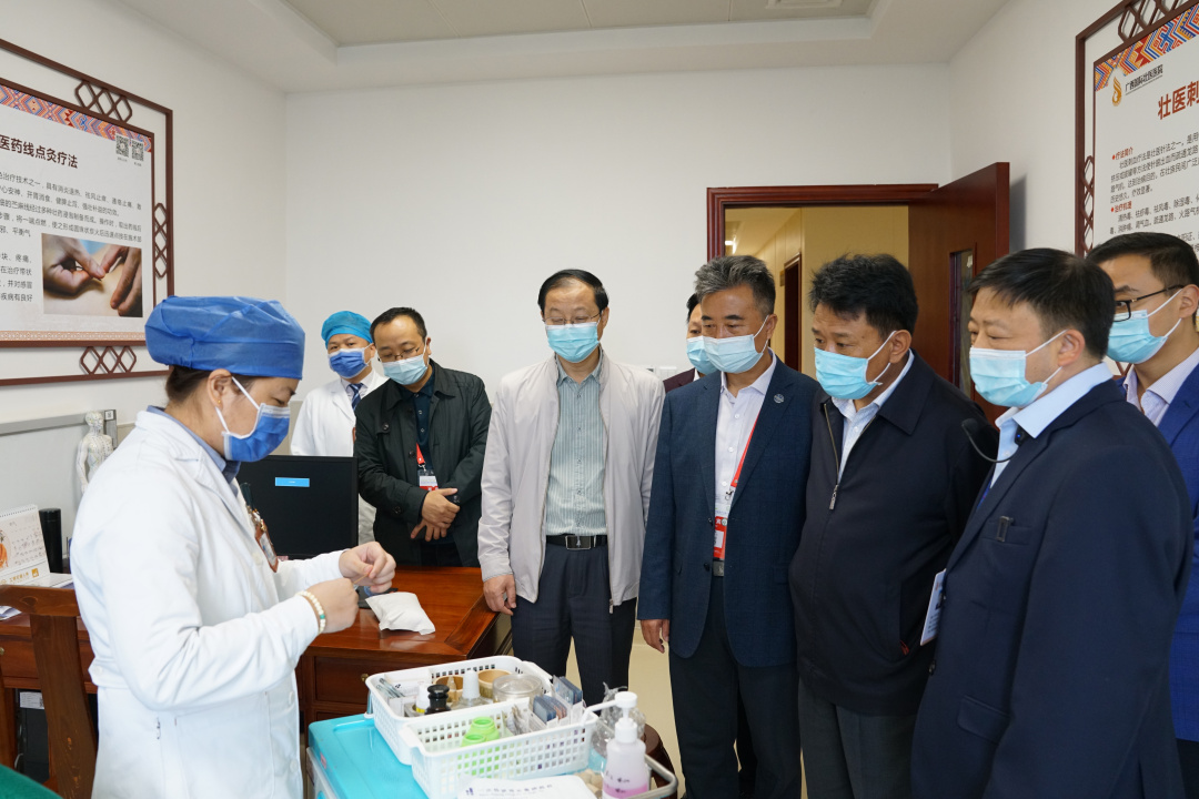 在民族医学特色诊疗中心,领导、专家们对民族医技法表现出了浓厚的兴趣,纷纷与一线医务人员细致交流,重点考察了技法的理论、来源和操作方法。