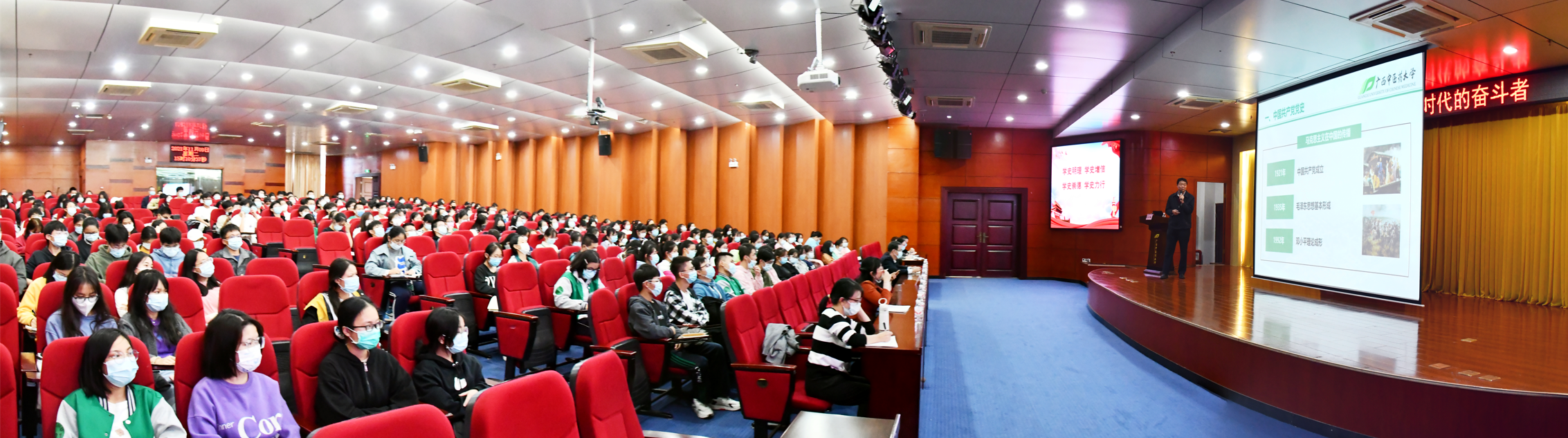 尤剑鹏以《坚定理想信念,做新时代的奋斗者》为题,从“中国共产党党史”“新中国成立以来主要发展成就”“自觉维护意识形态安全”“做新时代的不懈奋斗者”四个篇章,回顾了中国共产党从小到大、从弱到强的发展历史,再现了党在中国革命、建设、改革等不同时期的重要时间节点和重大历史事件,为广大学子如何从学习党史中感悟伟大精神的创新力量、从学习党的百年历史中汲取当代青年的前进智慧和奋进动力指明了方向。