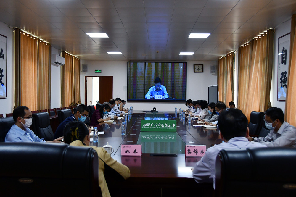 鸭脖在仙葫校区合德楼525会议室设立分会场,校党委书记莫锦荣,党委副书记、校长姚春以及相关职能部门(单位)负责人参加视频会。
