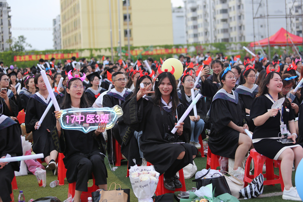 姚春以《胸怀壮志启新程,追光逐梦踏歌行》为题发表致辞,为2022届毕业生上了“最后一堂课”。姚春带领全体毕业生回顾了在桂中医共度的时光:这几年,我们欣逢盛世,共同礼赞党和国家百年芳华;这几年,我们步稳蹄疾,共同奏响学校发展时代强音;这几年,我们筑梦致远,共同实现大学青春精彩蝶变。“你们的支持理解和默默坚守是比‘诗与远方’更珍贵的情怀和担当,我为你们由衷地点赞!”对同学们在疫情防控中顾全大局、服从安排的表现,姚春给予了充分肯定。“艰难方显勇毅,磨砺始得玉成。当你们面对人生的千回百转和酸甜苦辣时,希望你们毫不畏惧面对一切艰难险阻,在劈波斩浪中砥砺奋进,在披荆斩棘中开辟天地,在攻坚克难中淬炼本领,做走在时代前列的奋进者、搏击者。”