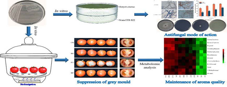 由灰葡萄孢菌(Botrytis cinerea)引起的番茄灰霉病是番茄采后主要病害,严重影响番茄仓储和运输,化学杀菌剂仍是目前有效防控灰霉病的方法,对环境和人类健康产生极大风险,开发一种安全有效的替代策略来控制番茄等多汁果蔬采后灰霉病具有重要的意义。本研究阐明了菌株ETR-B22挥发物可以抑制灰霉病菌丝生长和孢子萌发,并引起菌丝细胞死亡。通过挥发物熏蒸可有效抑制番茄灰霉病的感染,并延缓番茄果实营养品质的恶化。非靶向代谢组学分析显示,熏蒸处理可改变健康番茄果实的挥发物特征,但不影响番茄果实的香气成分。此外,我们还考察了生长基质、接种体积、浓度以及接种方式对挥发物拮抗活性的影响。研究结果表明,菌株ETR-B22所释放的挥发性代谢物可作为一种潜力极佳的生物熏蒸剂应用与番茄采后贮藏与保鲜。本研究为“桂十味”药材山豆根内生菌资源的开发利用奠定基础,也为新鲜药材仓储技术研发提供参考。