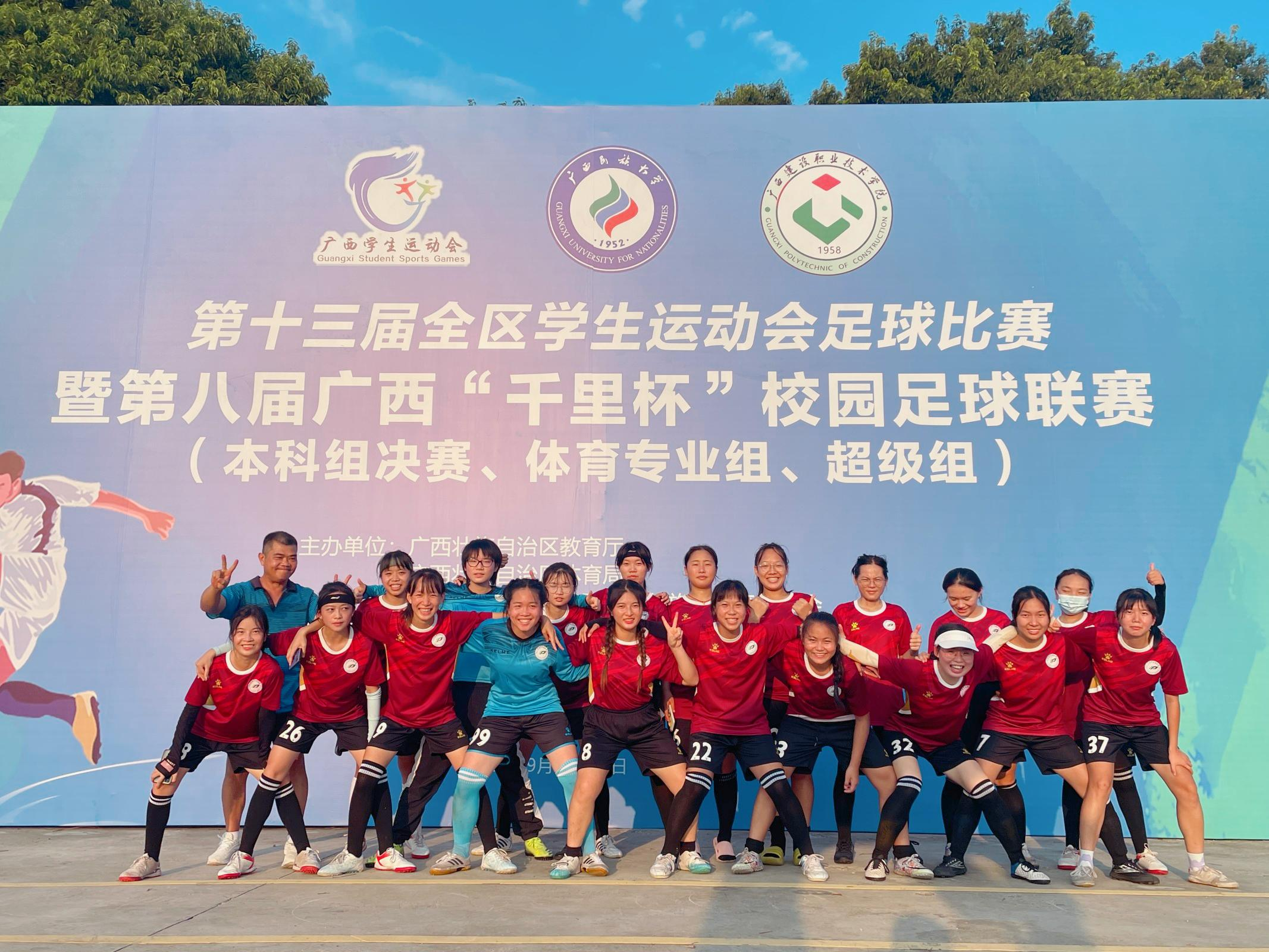 2022年9月2日—9月9日,在这秋高气爽,艳阳高照的时节,广西壮族自治区第十三届全区学生运动会足球比赛暨第八届广西“千里杯”校园足球联赛(本科组决赛、体育专业组、超级组)在海浪体育训练基地成功举办。本次比赛由广西壮族自治区教育厅、体育局、中国共产主义青年团广西壮族自治区委员会主办,广西民族大学、广西建设职业技术学院承办,广西学校体育卫生艺术学会协办。本次足球比赛是学生运动会最后一个比赛项目,共有全区23所高校的33支足球队伍参加,经过6天6场在绿茵场上的激烈角逐,鸭脖女足荣获本科组女足比赛的第六名和体育道德风尚奖。