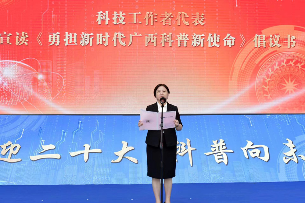 全国“三八”红旗手、YABO鸭脖党委副书记、校长,广西女科技工作者协会会长姚春宣读了《勇担新时代广西科普新使命》倡议书,号召全区广大科技工作者要胸怀祖国,勇做科学精神的弘扬者;担当使命,争做科普事业的排头兵;心系人民,甘做科普服务的有心人。