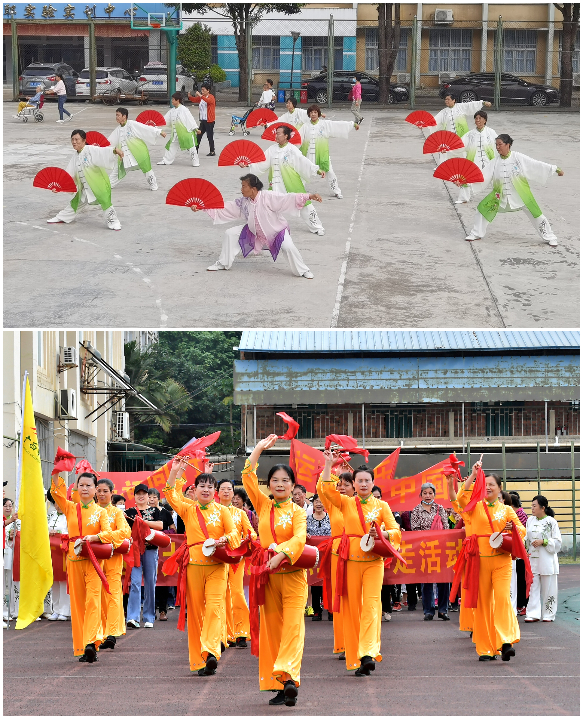 活动以老年艺术队一段精彩的“太极功夫扇”表演开场,接着17名老年腰鼓队员走在队伍的最前面,以铿锵的鼓点和激昂的旋律,击出了昂扬的激情和澎湃的风采。老同志们走在和熙的暖阳下,高呼着“我运动,我快乐”个个精神抖擞,步伐矫健,运动场上一片欢声笑语、生机勃勃。