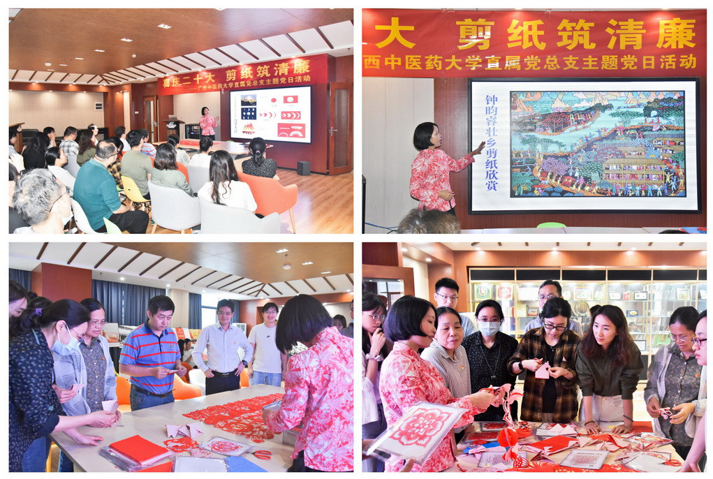 11月15日,直属党总支开展“喜庆二十大 剪纸筑清廉”主题党日活动,邀请广西工艺美术大师、南宁剪纸非物质文化遗产代表性传承人钟昀睿老师讲党史,传授剪纸技艺