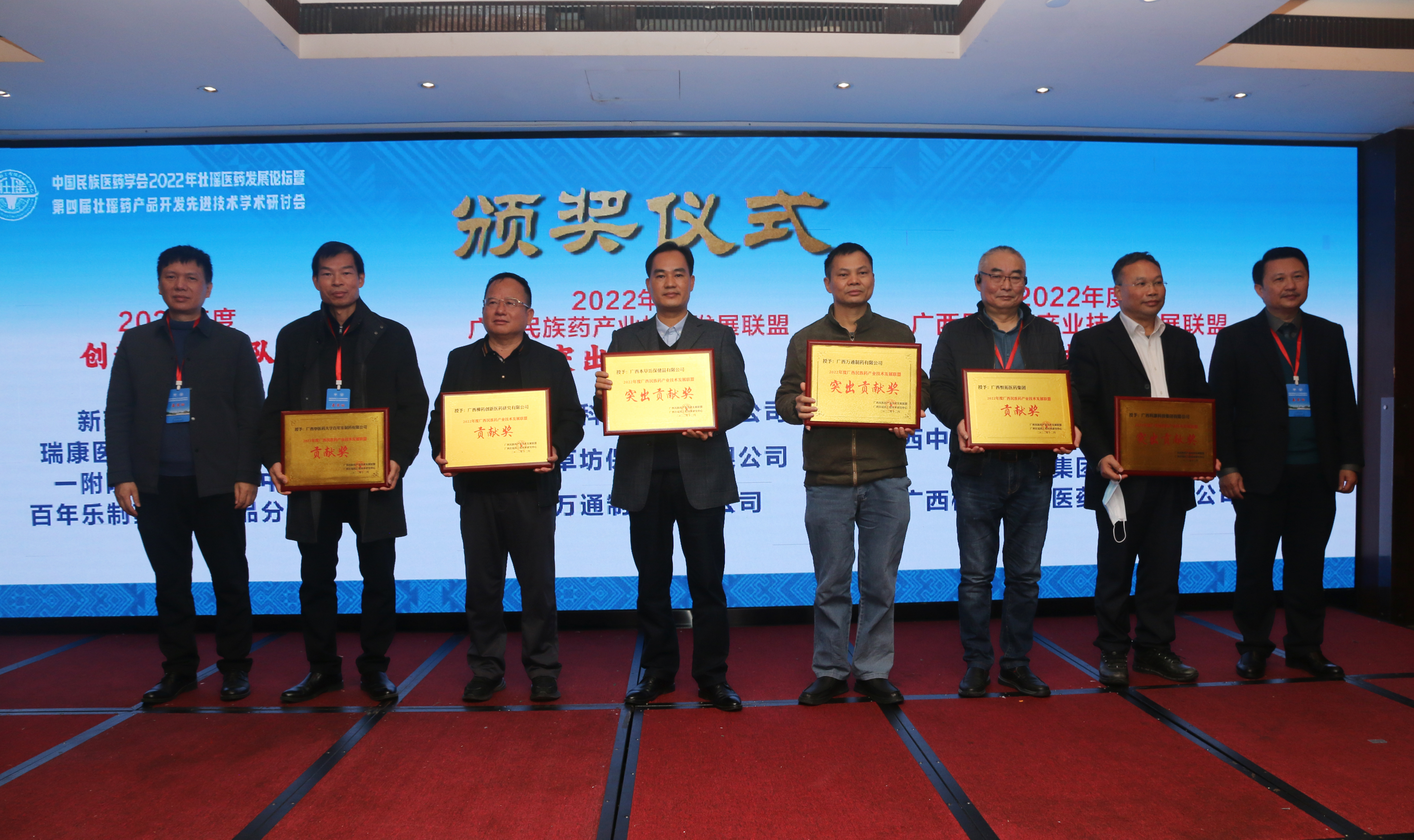 会上举行了广西壮瑶药工程技术研究中心第二届专家指导委员会成立及聘书颁发仪式。大会还进行了广西民族药产业技术发展联盟新增联盟单位授牌仪式,同时为2022年度在民族药产业技术发展领域作出杰出贡献的企业、单位和团体进行了颁奖。