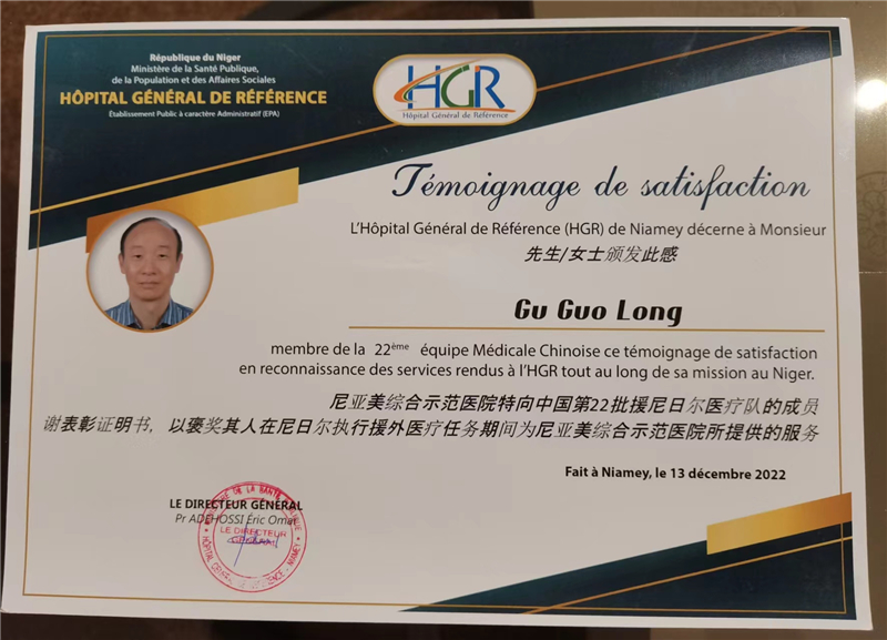 2021年1月29日,正值牛年新春佳节之际,顾国龙肩负着祖国和人民的重托,在领导和同事们的嘱托下,辞别了妻女,踏上了为期二十二个多月的援尼日尔医疗之旅。在背靠着撒哈拉沙漠的尼日尔,他和医疗队员克服自然条件恶劣、物资短缺、语言障碍、传染病威胁等诸多困难,发扬中国医疗队“不畏艰苦、甘于奉献、救死扶伤、大爱无疆”的精神,践行“自强不息,团结拼搏,敢为人先”的瑞康精神,以仁心和真诚投身援外工作,积极帮助当地医务人员提高医疗技术水平,为受援医院在新技术、新方法方面取得多项突破,确诊了许多疑难病例,发现了多例稀有血型,受到医院和中国驻尼日尔大使馆领导高度肯定和赞誉。
