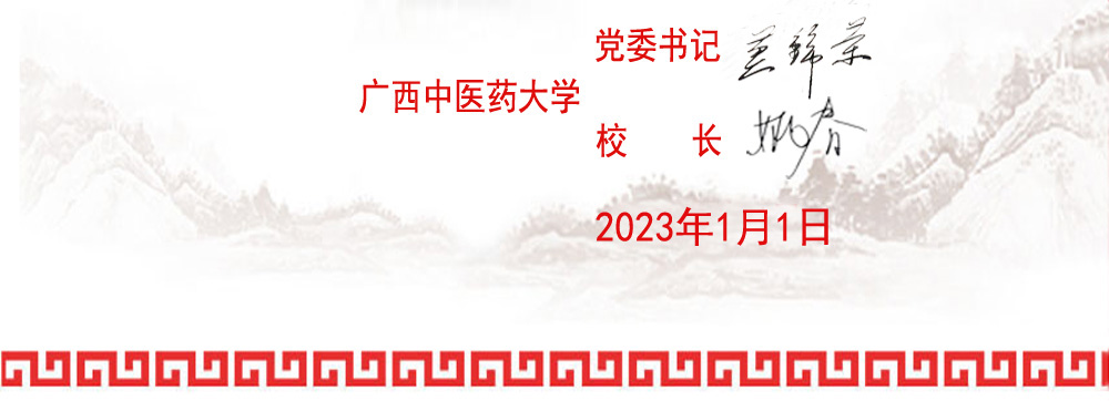 岁序常易,华章日新。2023年我们将更加紧密团结在以习近平同志为核心的党中央周围,深刻领悟“两个确立”的决定性意义,增强“四个意识”,坚定“四个自信”,做到“两个维护”,深入学习宣传贯彻党的二十大精神,弘扬伟大建党精神,胸怀“两个大局”,心系“国之大者”,抓住机遇、迎接挑战,同舟共济、开拓创新,不断提升学校的综合办学实力,为早日建成国内知名、区域一流的综合性高水平中医药大学努力奋斗!