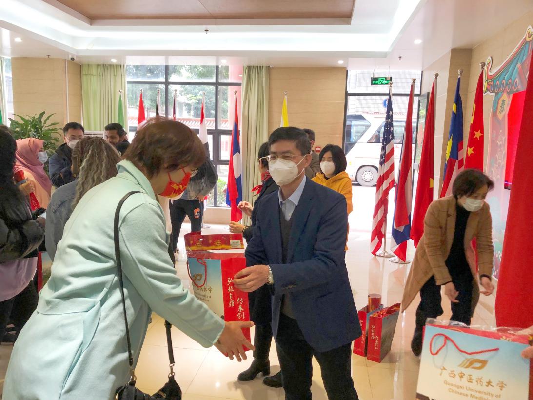 活动现场设在留学生楼办公区大堂,来自巴基斯坦、印度、柬埔寨、老挝、马来西亚、尼日利亚、泰国、越南等国家和香港特别行政区的40余名留校学生、外籍教师、国际教育学院院长蒋基昌及教师代表参加了本次慰问活动。