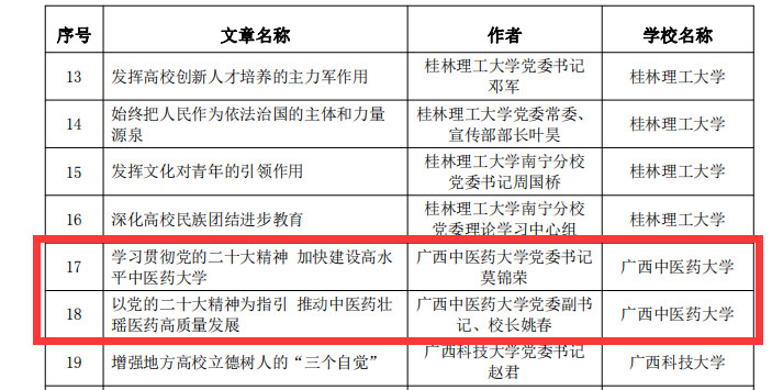 近日,自治区党委教育工委印发《关于公布2022年度广西高校党委理论学习中心组优秀学习品牌和优秀理论(调研)文章的通知》,公布入选2022年度广西高校党委理论学习中心组优秀学习品牌和优秀理论(调研)文章的单位和个人。鸭脖党委书记莫锦荣撰写的《学习贯彻党的二十大精神 加快建设高水平中医药大学》,校长姚春撰写的《以党的二十大精神为指引 推动中医药壮瑶医药高质量发展》入选2022年广西高校党委理论学习中心组优秀理论(调研)文章。