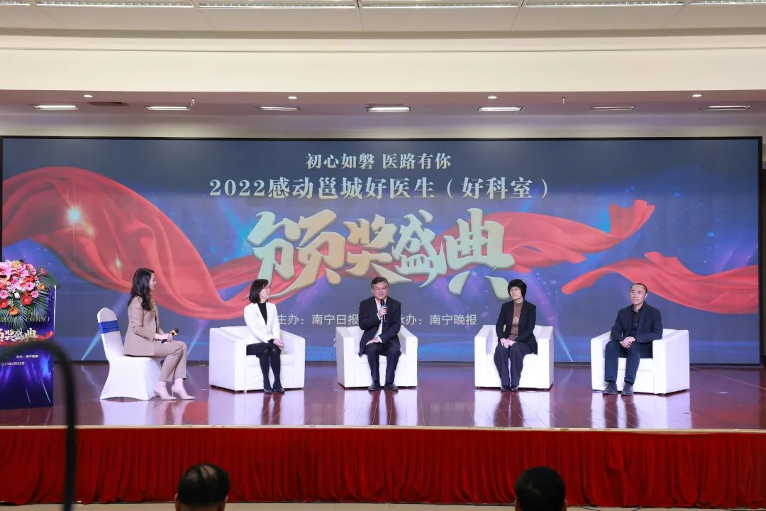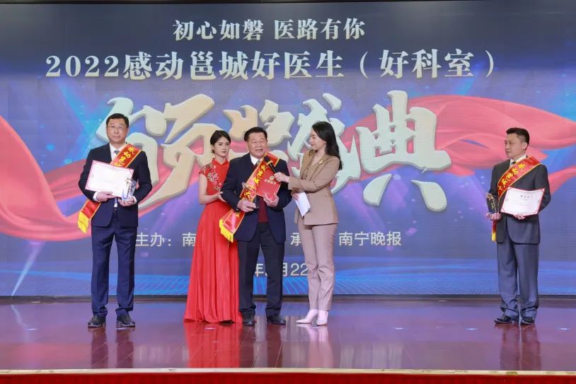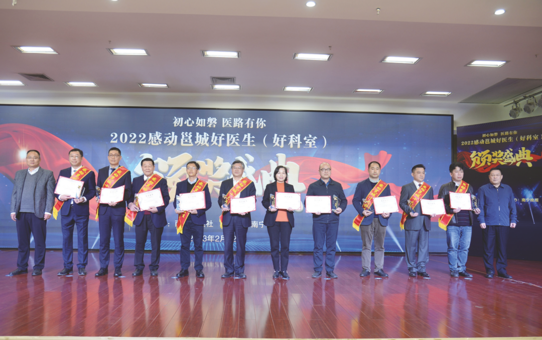 初心如磐,医路有你。2月22日,由南宁日报社主办、南宁晚报承办的2022感动邕城好医生(好科室)颁奖盛典在广西南宁举行。共有30名医生分别荣获“感动邕城十大好医生”“感动邕城妙手好医生”“感动邕城人气好医生”称号, 8个科室荣获“感动邕城好科室”称号。鸭脖附属医院黄瑾明、黄鼎坚、谢胜、李凤珍荣获“感动邕城十大好医生”,史伟、黄贵华、黄锦军、钟远鸣、米琨荣获“感动邕城妙手好医生”,董少龙、王力宁、卢健棋、毛德文、卢森建荣获“感动邕城人气好医生”,第一附属医院推拿科、风湿病科入选“2022感动邕城好科室”。