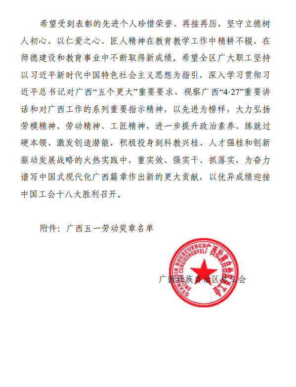 【喜讯】鸭脖方芳老师荣获广西五一劳动奖章